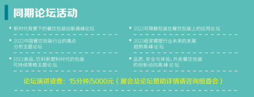 展出范围: 餐饮外卖包装: 一次性可降解包装,纸包装容器,纸浆模塑餐具,茶/果饮容器,西餐小食包装,铝箔制品,竹木制品,吸塑/注塑餐盒,预制食品包装,刀叉勺餐具,纸/PLA/竹制吸管,纸/PLA/无纺布包装袋,保温/保鲜/密封袋; 食品包装及容器: 休闲食品、调味品,罐头,乳制品及蛋类,肉类、禽类,熟食及方便食品,糖果、干果及冰淇淋,烘焙食品,新鲜果蔬,罐藏食品,水产品,腌制肉类,有机食品,谷物杂粮,预制食品等包装及容器: 饮料酒水包装及容器: 非酒精饮料,乳品,烈酒红酒及啤酒,功能性饮料等包装及容器; 商超新零售: 商超便利店用PLA购物袋、无纺布购物袋、纸质购物袋,保鲜膜、保鲜袋、保温袋等; 包装机械设备: 制盖机,制瓶/杯机,制箱/盒机,制碗机,纸浆模塑机,贴标机,收缩包装机等; 包装材料及配件: 缓冲包装材料,无菌包装材料,防腐保鲜包装材料,功能性薄膜,纳米包装材料,纤维制品,其他自然包装材料,标签、瓶盖、软管、易拉盖、提手、拉链等 包装服务: 包装设计方案,整体包装解决方案服务,包装互联网+平台,个性化包装解决方案等