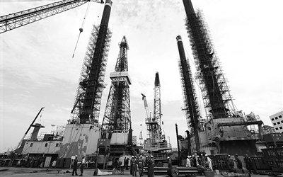 上图 7月6日在山东石岛集团干船坞拍摄的维修中的海上石油钻井平台“渤海7号”。 王福东摄(新华社发)